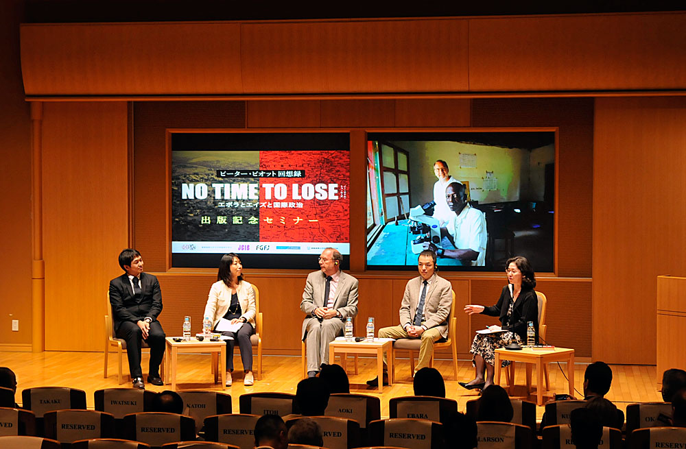 The seminar opened with Miki Ebara, editor-in-chief of NHK World’s Newsline, interviewing Dr. Piot about his book, his early work with the Ebola virus, and later his frustrations and accomplishments as one of the top international bureaucrats fighting the spread of HIV/AIDS. “I was lucky that soon after I assumed the position, antiretroviral (ARV) drugs were developed and AIDS became treatable,” said Dr. Piot. He concentrated his efforts on providing the newly available ARV therapy (ART) to developing countries. Fighting hard against skeptics who claimed it would be impossible to provide expensive ART in Africa, given the weak health systems there, he led negotiations with pharmaceutical companies to procure the drugs at reduced prices and started pilot projects that provided ART in Africa to demonstrate that it was actually possible. In 2000, working with colleagues, he successfully brought AIDS to the agenda of the UN Security Council, placing it on the public health agenda for the first time. He recalled that was the real breakthrough that led to the reduced price of ARV drugs and the establishment of new funding mechanisms such as the Global Fund.
