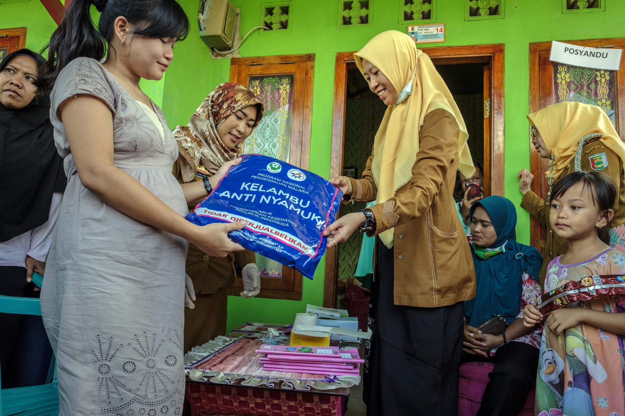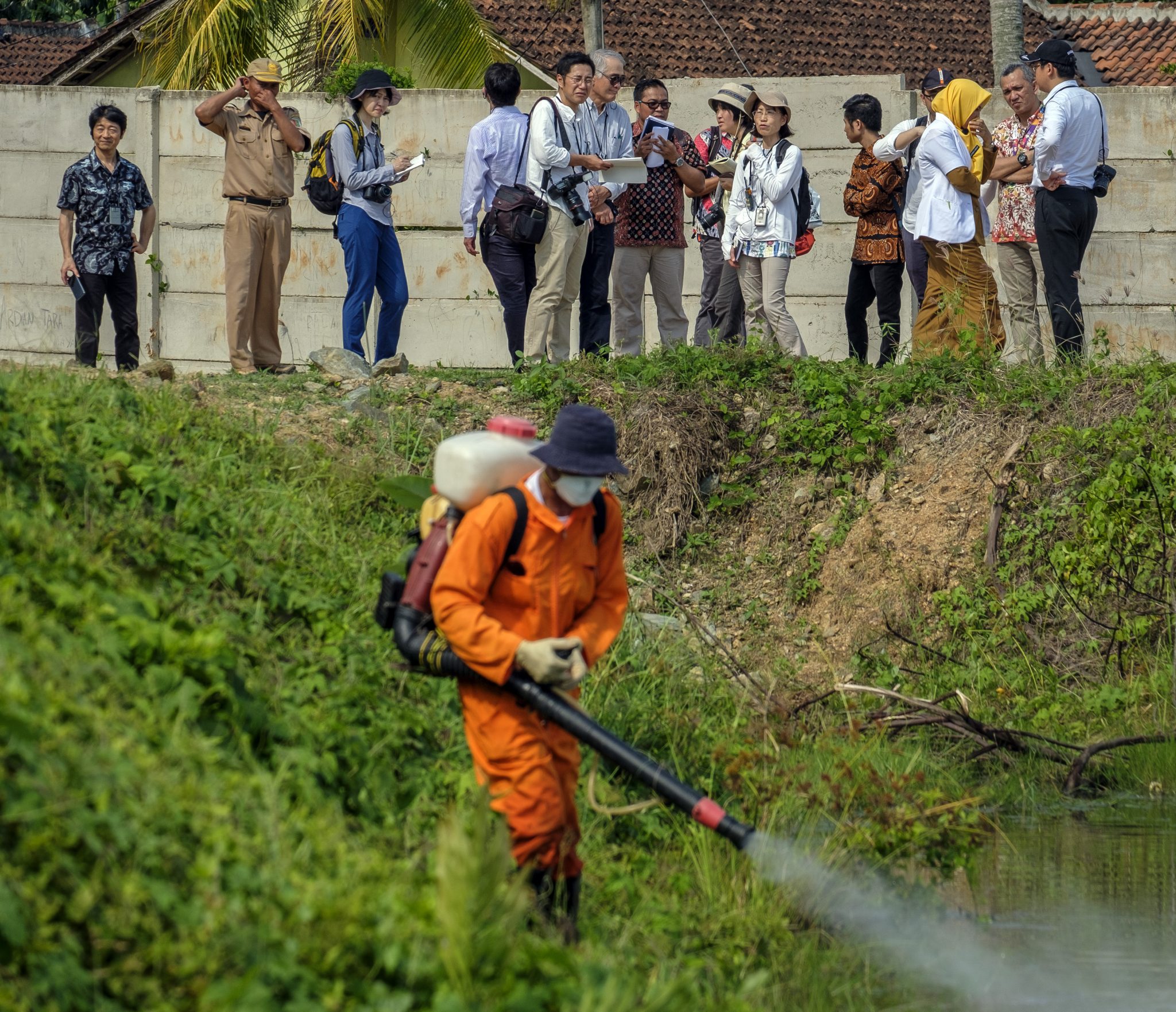 The delegation also traveled to the Pesawaran regency of Lampung Province to see a unique malaria program. In this area, abandoned shrimp and fishing farming ponds are turning into breeding sites for mosquitoes. Since many Japanese are not familiar with the measures needed to deal with malaria, it was an eye-opening experience for the journalists to see how bednets are being used and what is being done with larvicide and indoor residual spraying.