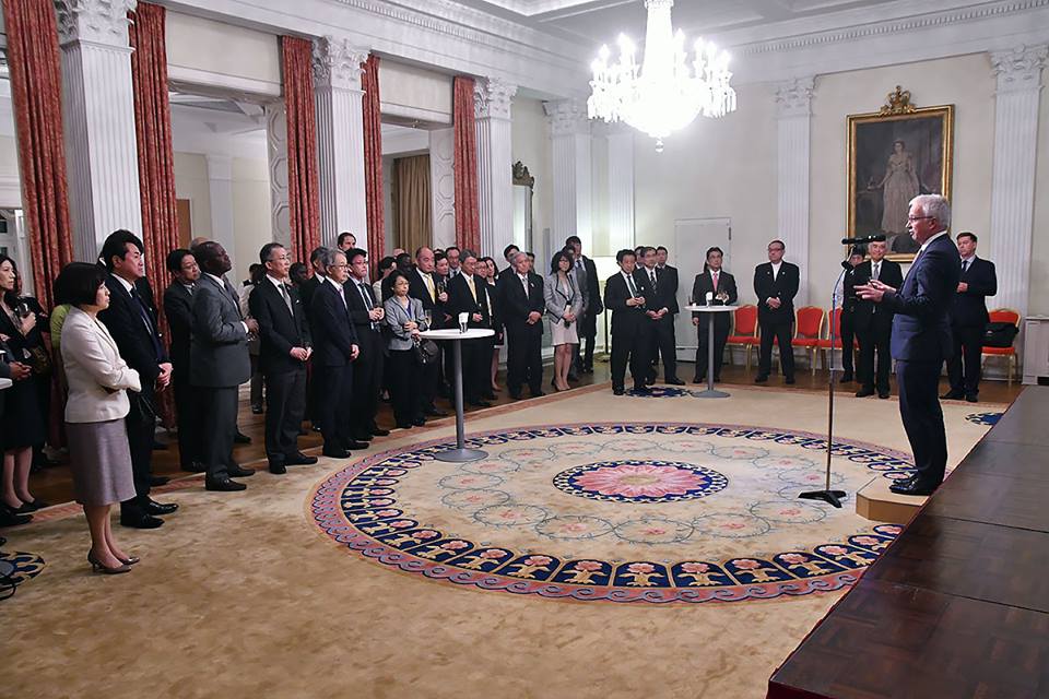 Finally, to commemorate both Mr. Sands’ visit and World Malaria Day (April 25), JCIE and the British Embassy in Tokyo co-hosted a reception where we welcomed ambassadors to Japan from African countries, the former Minister of Health Yasuhisa Shiozaki (Chairman of the UK-Japan 21st Century Group), and Representative Ichiro Aisawa (Co-chair of the Friends of the Global Fund, Japan), among others. The group was treated to a production of a traditional Japanese kyogen performance that depicted a battle between a master and an enchanted mosquito disguised as a sumo wrestler.